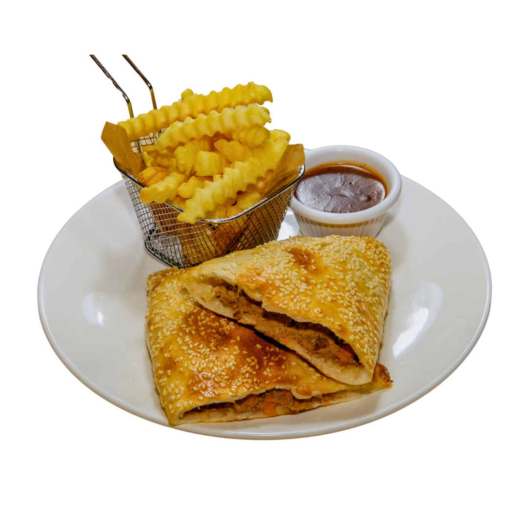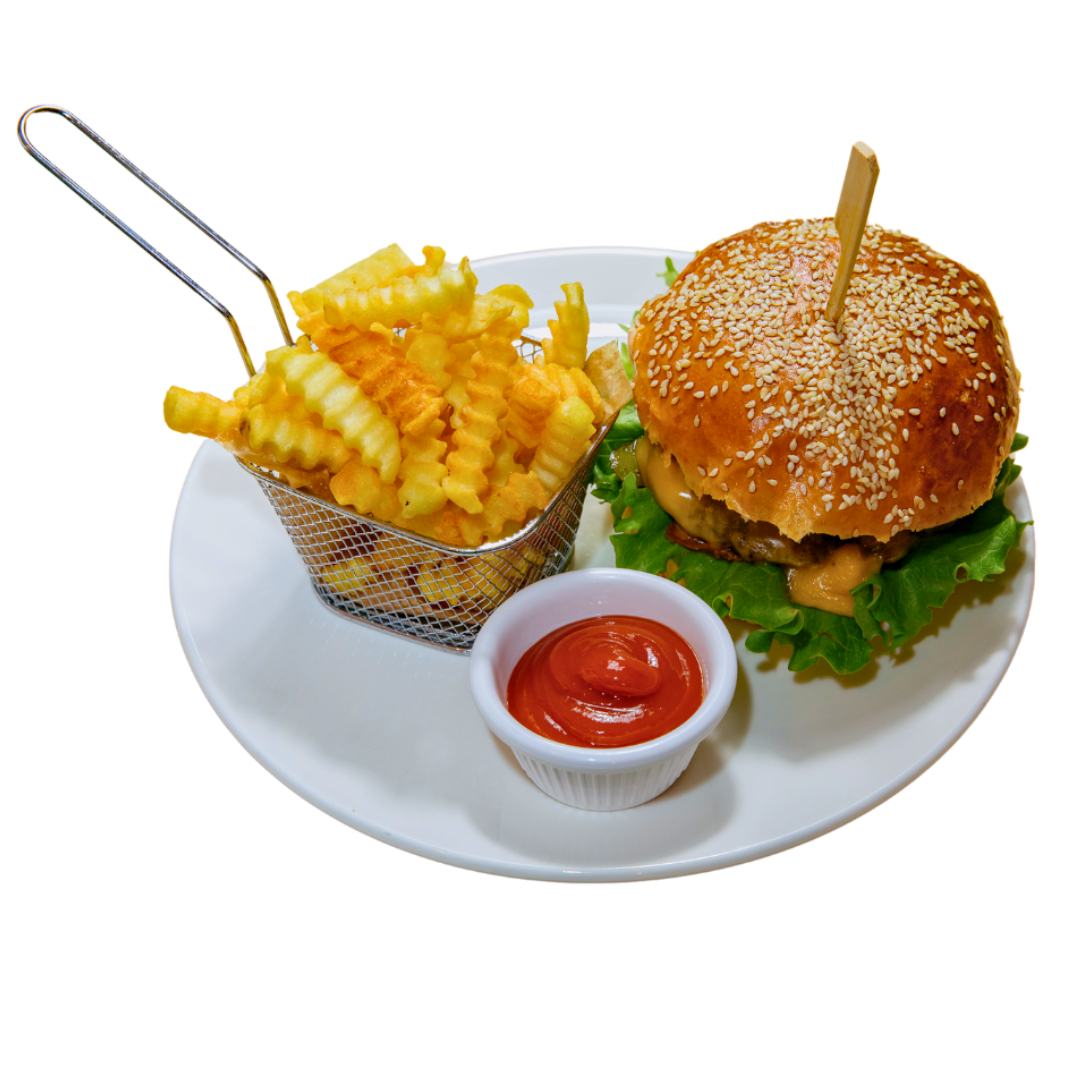 ยฝ lb (200 gr) homemade beef patty topped with onions, cheddar, tomato, gherkins and Brown’s Bar burger sauce; served in a toasted bun with crinkle-cut fries.