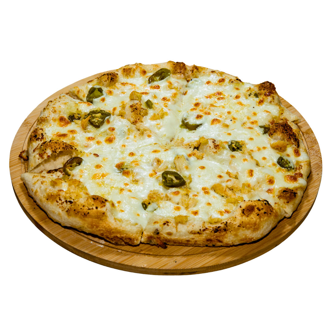 (Garlic infused pizza base with chicken, homemade jalapenos, mozzarella, topped with basil / rocket)