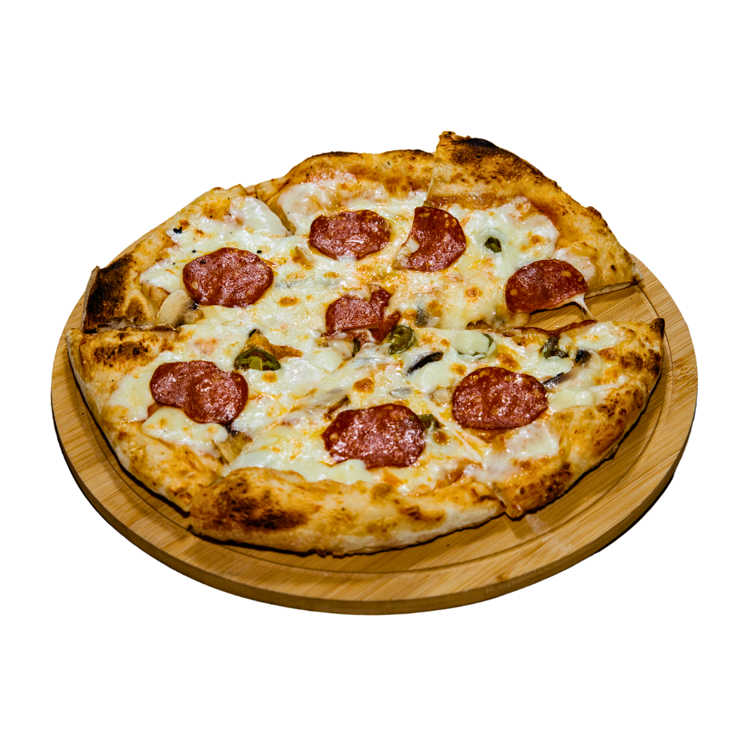 Neapolitan pizza base topped with ground beef, bacon, fresh green chilli peppers, onions & mozzarella.